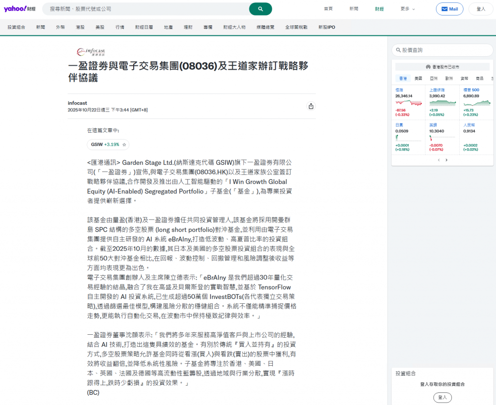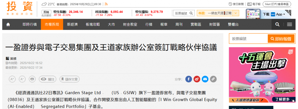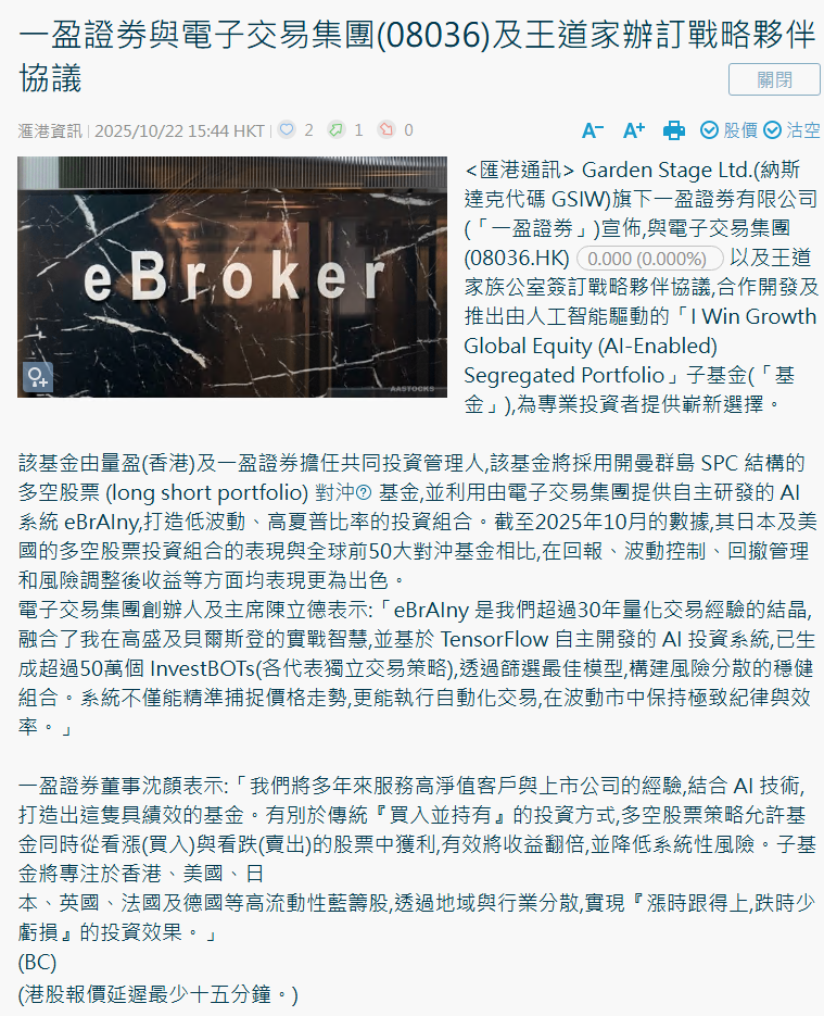 一盈證券與電子交易集團及王道家族辦公室簽訂戰略伙伴協議